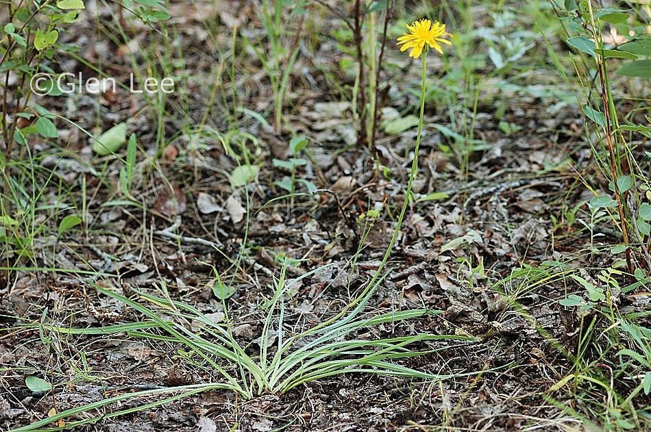 General: Perennial plant with a rosette of linear leaves and a long flower stalk bearing a single flower head. Plants have a milky sap. Stems are sparingly hairy.
