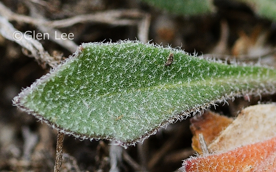 Leaves: Stem leaves alternate, clasping, oblanceolate to lanceolate, the stem leaf highlighted above was 20 mm long and 5 mm wide. Basal leaves are entire, oval, the basal leaf highlighted in the photo above was 25 mm long (including petiole) and 7 mm wide. Leaves are starry hairy.