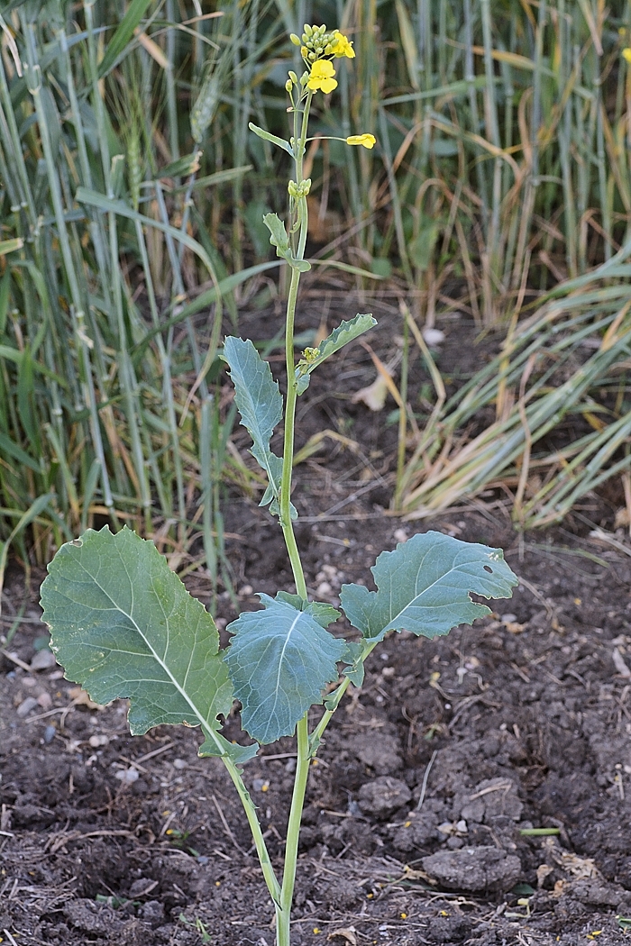How to identify this plant: 1) Glaucous and glabrous 2) upper leaves clasp the stem and have auricles. Similar species Brassica juncea is also glabrous and glaucous, however its upper leaves to not clasp the stem and do not have auricles.