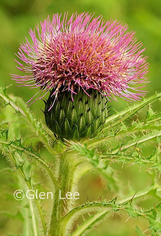 Leaves: Leaves very prickly, alternate, oblanceolate, leaf highlighted in photo above was 17 cm long by 4 cm wide. Leaves are divided 3/4 to the midrib, segments triangular in shape.