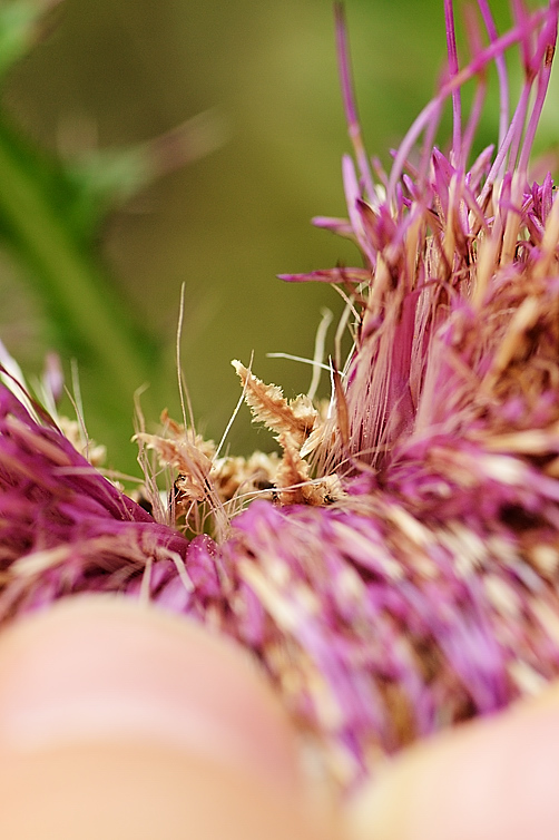 Flowers: Flower heads large, purple in colour, flower head measured at 7 cm diameter. Involucre measured at 4 cm tall. Lower bracts ovate measured at 15 mm long by 7 mm wide. Inner most bracts are wrinkled / twisted and have no spine.