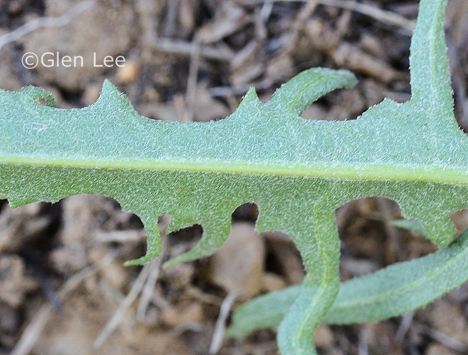 Leaves: Lower leaves in basal rosette, deeply pinnatifid, we measured a basal leaf at 16 cm long by 4 cm wide. Basal leaves with long, matted hairs on top and bottom surfaces. Stem leaves are similar in shape but reduced, the top most bract-like. Stem leaves alternate.