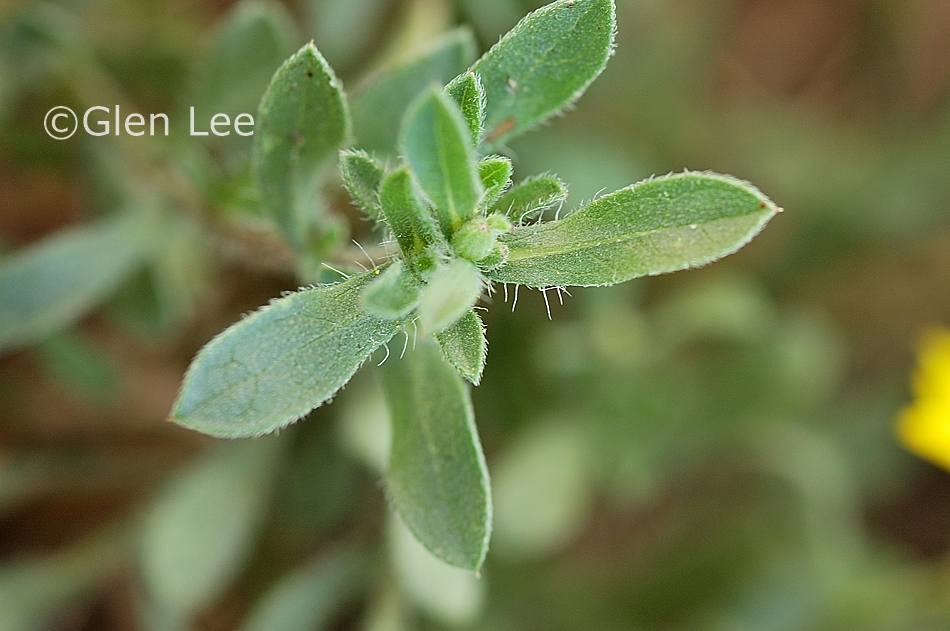 Leaves: Leaves are alternate, oblong-oblanceolate, we measured a leaf at 15 mm long, 5 mm wide, strigose, and greyish-green in colour.