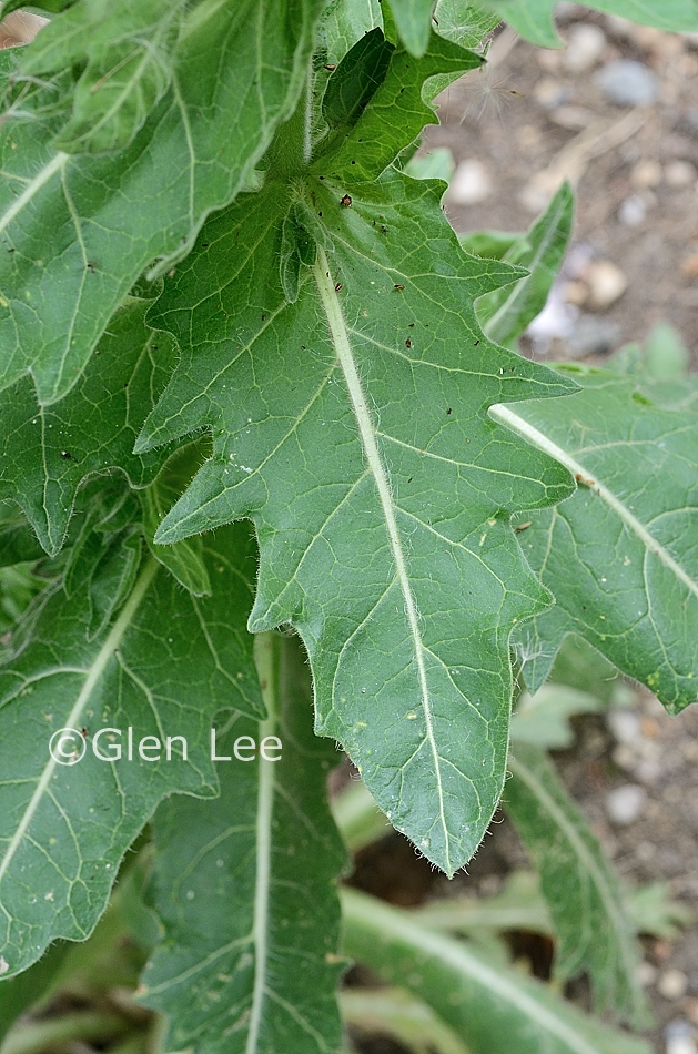 Leaves: Leaves are alternate, oblanceolate, irregularly toothed. The foliage is dark green with prominent white veining. Upper leaves are clasping, lower leaves have petioles. We measured an upper stem leaf at 11 cm long by 7 cm wide.