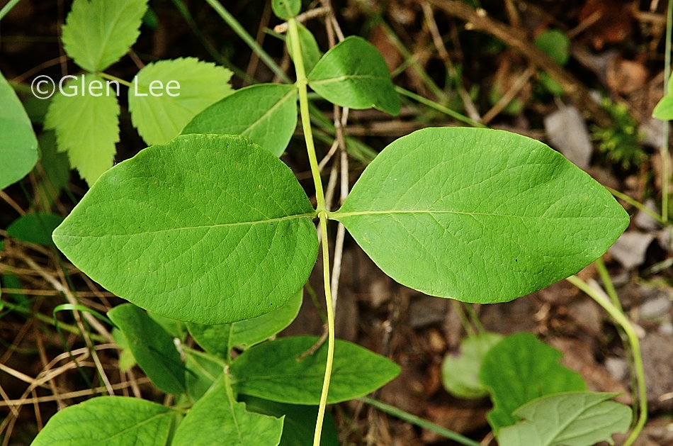 Leaves: Most leaves are opposite, obovate to oval, and have short petioles. We measured a large leaf at 9.5 cm long by 5.5 cm wide. The last one or two pairs of leaves nearest the stem tips are joined at their bases forming a cup around the stem and/or at the base of flower clusters. Leaves are hairless on top, pubescent below.