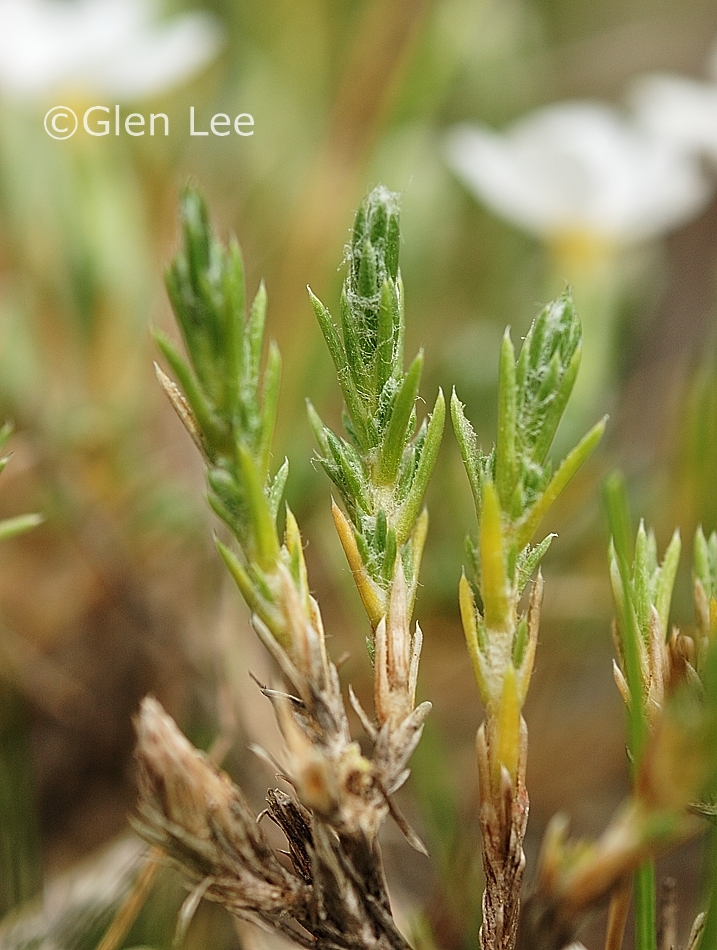 Leaves: Leaves opposite, somewhat imbricate (overlapping), linear, sharp-tipped, somewhat woolly. Leaf length measured to 5 mm.