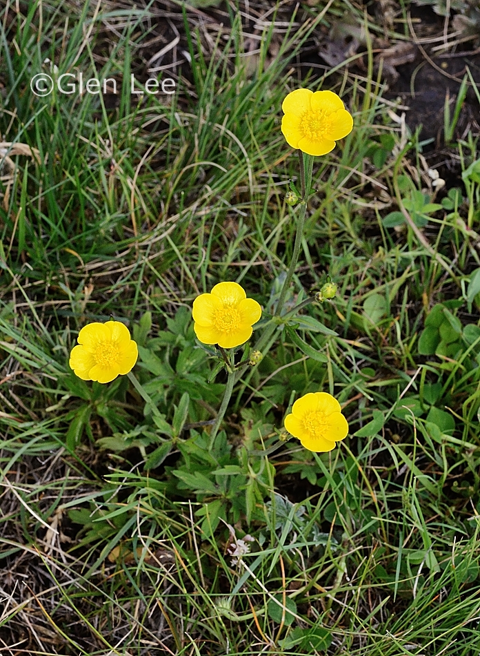 Flowers: Flowers bright yellow, large (for Ranunculus) to 2 cm diameter with petals 1 cm or more long, 1 to 4 flowers per flower stem. The edges of the petals touch one another. Flower stems sparsely hairy with long hairs.
