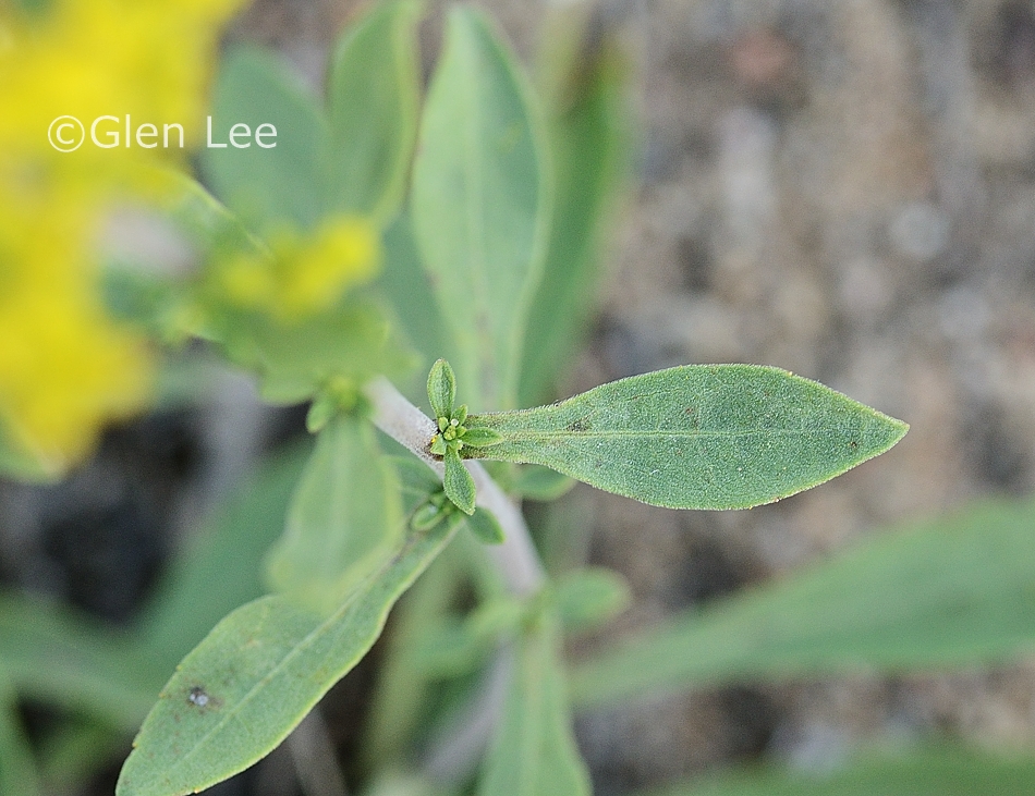 Leaves: Basal leaves oblanceolate to spatulate. Most leaves entire, some basal leaves shallowly crenate. The basal leaf blade highlighted in the photo above was measured at 30 mm long by 14 mm wide. Stem leaves alternate, elliptical to oblanceolate, reduced in size upwards. Stem leaf blade highlighted in photo above was 19 mm long by 8 mm wide. Leaves rough to touch, puberulent on top, hispid below.