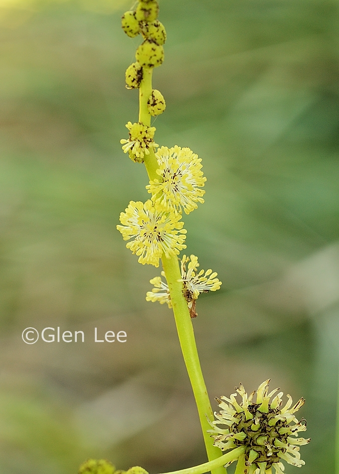 Flowers: Male and female flowers on separate heads on the same plant, male flower heads growing above female heads. Flower heads globose, there are 2-3 female flower heads, male heads more numerous. Female flowers often with 2 stigmas. Male flower heads measured to 10 mm diameter, female flower heads to 17 mm diameter, a head full of mature seeds measured to 28 mm diameter.
