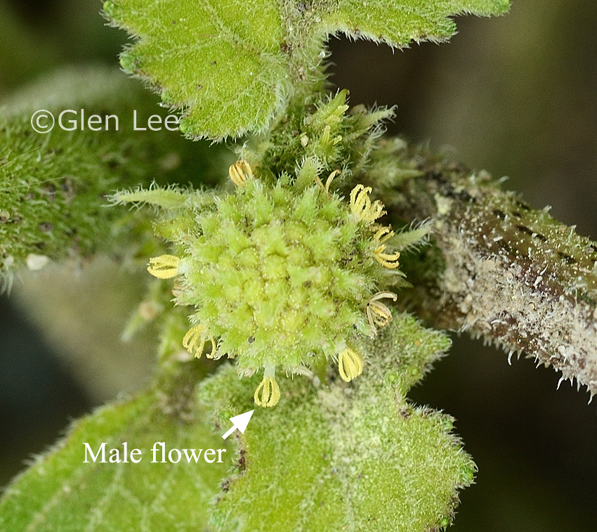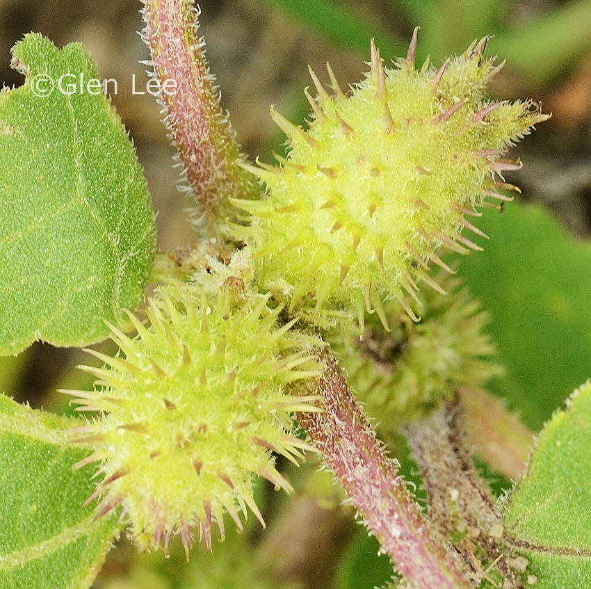 Flowers: Male flowers in globose flower heads. Female flower heads ending in two beaks each containing 1 flower, the flower having a divided style, the spiny involucre of the pistillate flower head developing into burs. We measured male flowers at 1.5 mm long, and the styles of female flowers at 2 mm long. Male flower heads were measured at 6 mm diameter, burs measured at 15 mm long.
